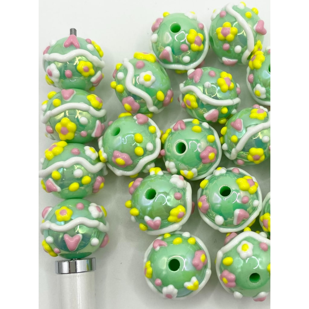 Green Acrylic Beads With Hand Painted Small Flowers And Hearts,Random Mix ,16mm,CT