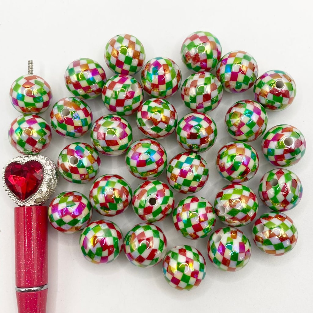 Glossy Green & Red Checkboard Acrylic Beads With UV Finish ,16mm,SJ